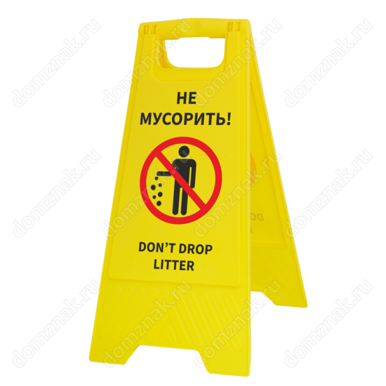 Сохраните чистоту в помещениях офиса, завода или любого общественного заведения, а также на прилегающих к нему территориях. Установите небольшую, но очень заметную табличку на пол «Не мусорить». Она удобна, устойчива и надежна. Занимает мало места при хранении. Имеет удобную ручку для перемещения с места на место. На табличку нанесены надписи на русском и английском языках, что дает возможность использовать ее в респектабельных заведениях, принимающих иностранцев.